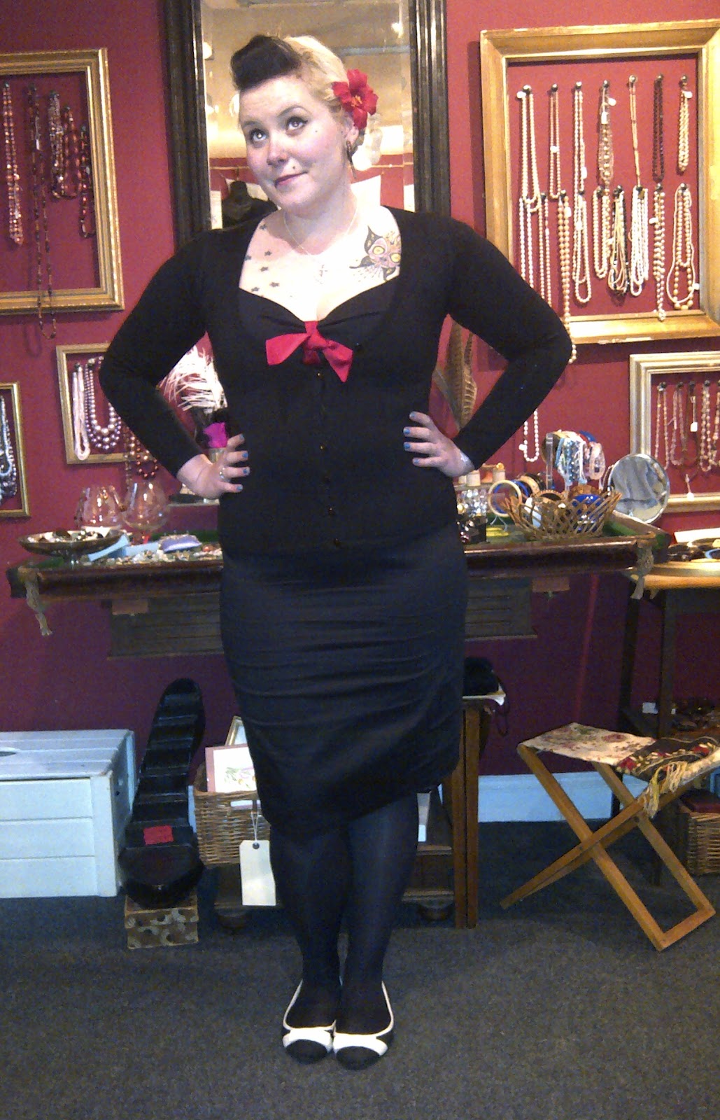 My Collectif Dolores Ahoy Dress, a plain sample cardigan, and some New Look pumps. Simple, but I like it!